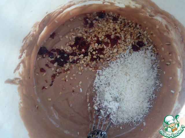 Затем вводим масло, коньяк, миндаль, измельченную клюкву и кококосовую стружку.