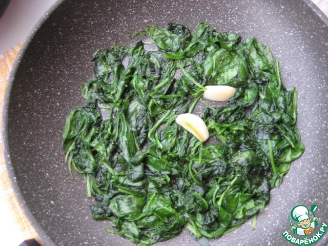Шпинат припустить на сливочном масле с зубчиком чеснока, остудить. Чеснок выкинуть.