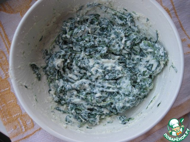 Смешать шпинат с рикоттой и пармезаном. Посолить, поперчить.