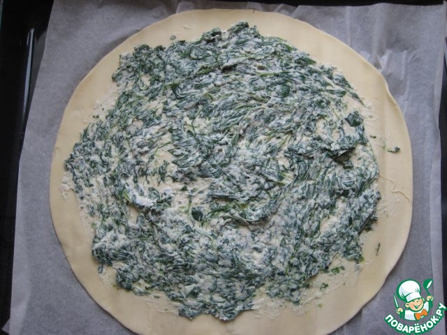 Выложить на противень лист теста вместе с бумагой для выпечки. Нанести шпинатный слой, не доходя немного до краев. Разровнять.