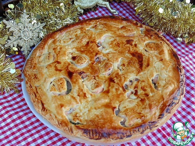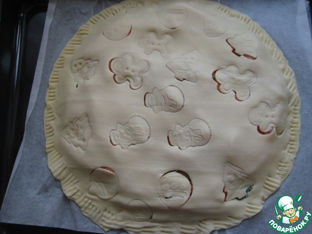 Накрыть вторым листом теста, защипнуть края, я прошлась зубчиками вилки, сделать насечки на тесте, чтобы выходил пар, я сделала формочками для печенья.