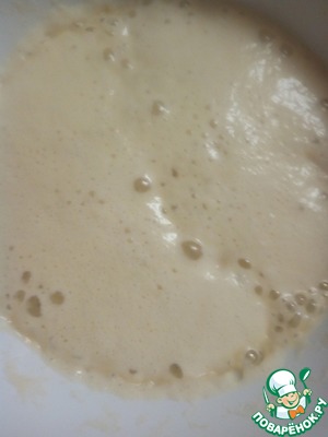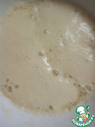 • Итак, сначала основа пирога. В теплом молоке растворить 1 ч. л. сахара из общего количества, раскрошить дрожжи, добавить 1 ст. л. муки из общего количества. Перемешать и оставить на 15 минут в теплом месте до активации дрожжей.