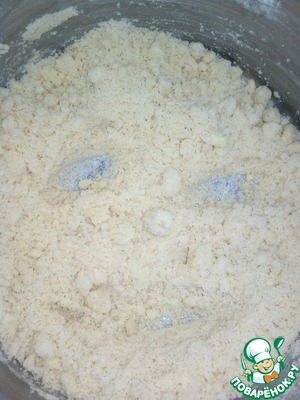 • Муку просеять с солью. Добавить оставшийся сахар и манную крупу, перемешать. Холодное масло порезать кусочками и перетереть в крошку с мучной смесью.