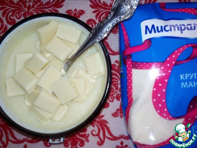 Молоко довести до кипения, тонкой струйкой всыпать манную крупу и сварить густую манную кашу. Добавить сахар, лимонный сахар (или лимонную цедру) и белый шоколад. Перемешать до растворения шоколада. Оставить остывать.