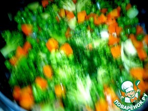Следующим добавить зеленый горошек и также обжарить пару минут.
