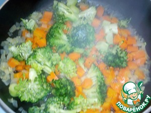 Добавить брокколи, разобранную на мелкие соцветия, и обжарить еще 1-2 минуты.
