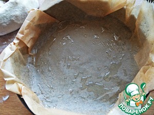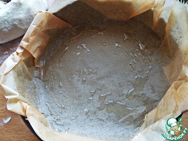 • Съёмную форму 17 см в диаметре застилаем смазанным пергаментом.