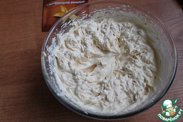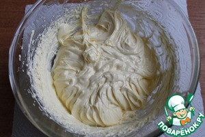 Итак, вернемся к крему. Продолжая взбивать его, вливаем постепенно коньяк и всыпаем ванильный сахар. Снова взбиваем до растворения крупинок сахара. Крем должен получиться гладкий, пышный, однородный.