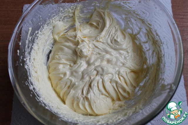 Пока пропитка охлаждается, займемся кремом. Сливочное масло нужно заранее достать из холодильника, чтобы оно размягчилось. Взбиваем его до побеления, добавляем порциями сахарную пудру и вливаем сгущенное молоко.