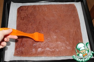 А тем временем пропитаем бисквит. Для этого лучше воспользоваться кистью - окунаем ее в пропитку, стряхиваем излишки и промазываем несколько раз всю поверхность бисквита. Если пропитка осталась, а бисквит уже достаточно влажный, не нужно стремиться использовать ее всю. Чересчур пропитанный бисквит станет очень нежным и может деформироваться при сворачивании.