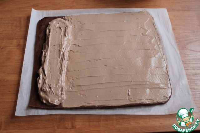 Приступим к сворачиванию нашего рулета. Бисквитный пласт промокнем от излишков сиропа бумажной салфеткой (если необходимо). Неровные края можно обрезать острым ножом. Расстилаем его на чистом листе пергамента и достаем крем из холодильника. Наносим широкую кремовую полосу у края бисквита, весь остальной пласт также промазываем кремом.