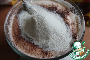 В три приема просеиваем муку с разрыхлителем и крахмалом, аккуратно перемешиваем до получения однородной массы.