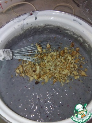Будьте готовы к увеличению объема в 3 раза. Затем добавляю соду и смородину. все хорошо взбиваем. Просеянную муку добавляем. Все перемешиваем.