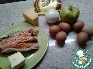 Белки, майонез, сыр, замороженное сливочное масло натереть на терке, лук, майонез, яблоко, лосося, майонез. Сверху на мелкой тёрке натереть желтки. -