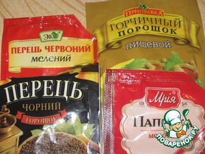 Ошеек порезать на порционные кусочки. Приготовить смесь из перцев, паприки, соли и горчицы, размешать, втереть ее в мясо, оно станет рыжее. Оставить мариноваться на ночь.