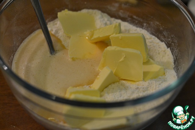 Добавить к муке марципановую массу и масло, нарезанное на кусочки.