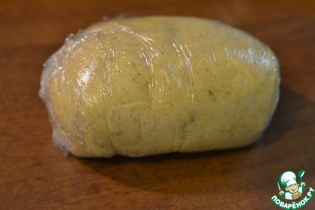 Замесить тесто и завернуть его в пленку. Оставить в холодильнике на 30 минут.