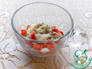 В майонез добавляем мелко нарезанный болгарский перец и черный перец. У меня майонез сделан по рецепту http://www.povarenok .ru/recipes/show/142 512/