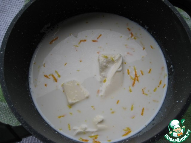 В кастрюлю налить молоко, положить масло, цедру лимона и апельсина натертую на мелкой терке. Поставить на огонь.