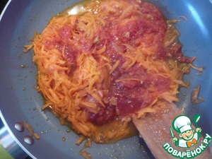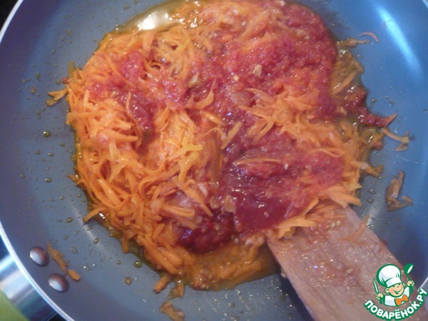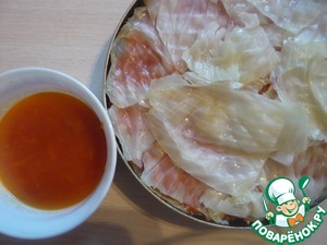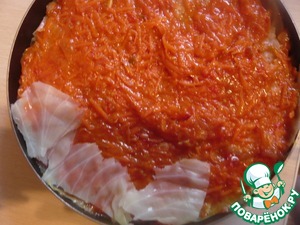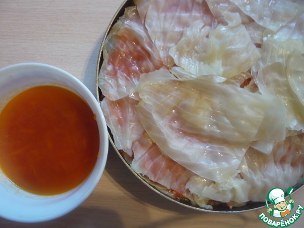 Покрываем верхний слой листьями капусты. Томатную пасту разводим капустной водой. (Я добавляю к такой смеси немного сахара, но это на любителя)