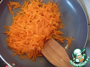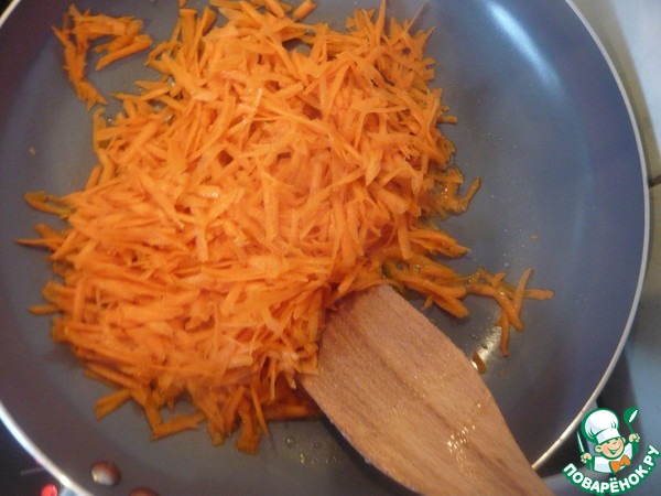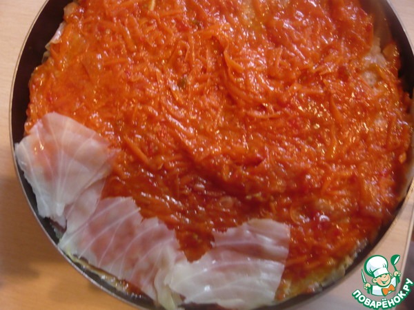 На фарш выкладываем часть моркови. Повторяем слои еще 2 раза.