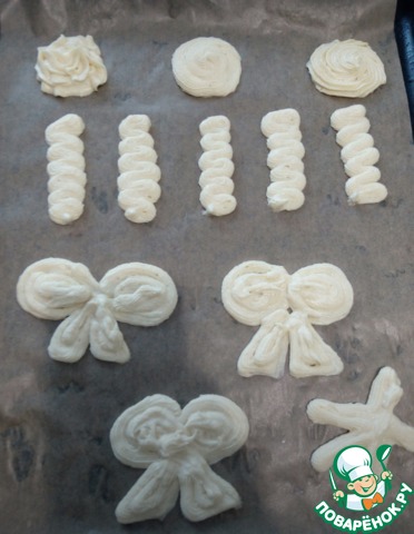 На противень застеленный пергаментом при помощи кондитерского мешка формуем печенье. Выпекаем при 170-175° в духовке 10-12 минут.