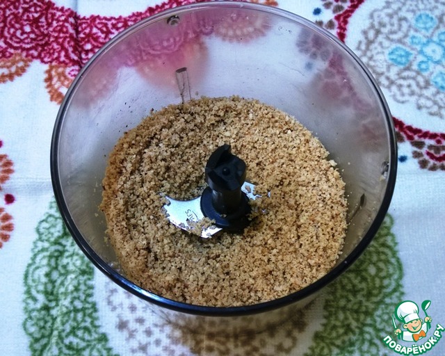 Орехи нужно превратить в мелкую крошку с помощью блендера. Можно использовать и готовую ореховую муку.