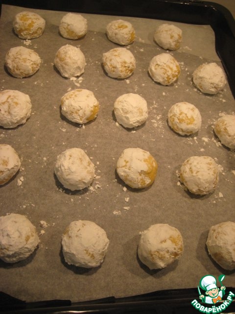 Скатать из теста шарики размером с грецкий орех. Обвалять в сахарной пудре.