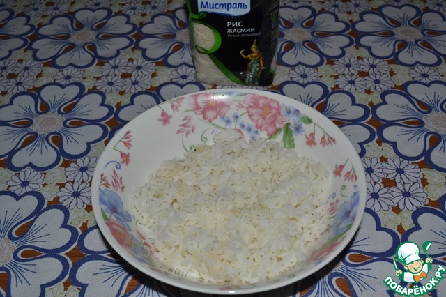 Рис залить водой, из расчета 1:2. Варить в подсоленной воде 12-15 минут, пока вода полностью не выкипит. Остудить. Рис ТМ «Мистраль» Жасмин очень ароматный, с приятным отчётливым вкусом, как раз очень хорошо подойдёт для вкуснейшей начинки.