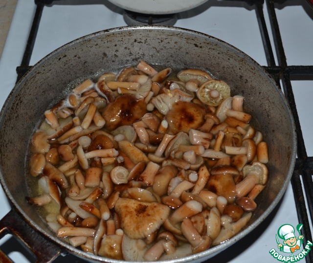 Грибы помыть, если надо порезать. Можно взять грибы, какие вам больше нравятся. У меня были замороженные опята, собственного сбора. С шампиньонами будет тоже очень вкусно. И так, положить грибы в глубокую сковороду, залить водой так, чтобы они были полностью покрыты. Как вода закипит, убавить огонь и варить 15 минут.