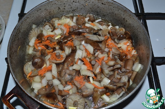 Затем добавить порезанный лук, морковь, натёртую на крупной тёрке и тушить ещё минут 15. Потом посолить, поперчить, добавить сливочное масло и хмели-сунели. Тушить ещё несколько минут, пока оставшаяся жидкость не выпарится. Огонь можно регулировать, а массу обязательно надо помешивать в процессе приготовления. Начинку остудить.