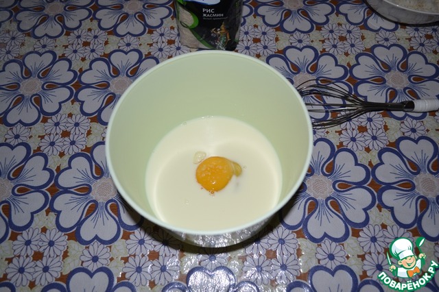 Пока рис и начинка остывают, приготовим тесто и пожарим коржи: в глубокую посуду влить молоко, добавить яйцо, слегка посолить, взбить венчиком.