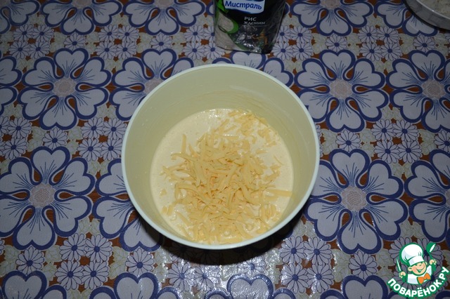 Всыпать муку постепенно, постоянно взбивая венчиком, чтобы не было комочков. Тесто должно получиться, как на блины. Влить растительное масло, перемешать. Добавить тёртый сыр, аккуратно перемешать ложкой.
