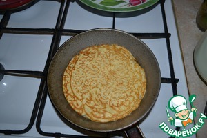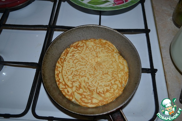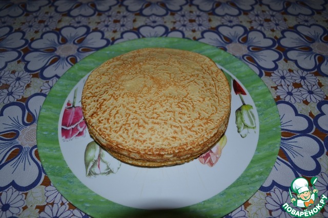 У меня получилось 8 блинов….2 из которых утащили дети. Это и к лучшему, так как 6 штук вполне хватило для получившегося количества начинки. Сколько коржей получится у вас, это зависит от размера сковороды.