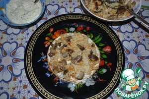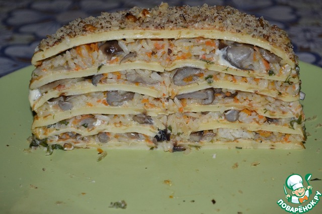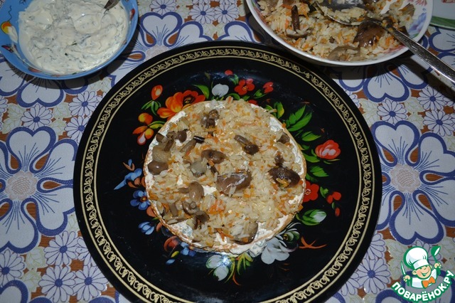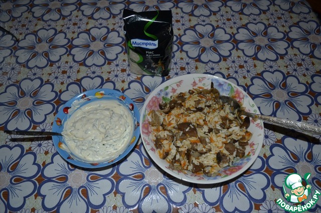 Теперь, приготовим соус и «скомплектуем» начинку. Для соуса: смешать сметану, выдавленный чеснок, готовую горчицу и порезанную зелень петрушки и укропа. Рис и приготовленную грибную начинку соединить, хорошо перемешать.