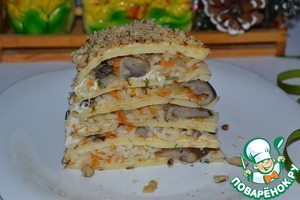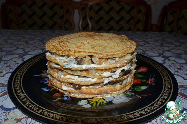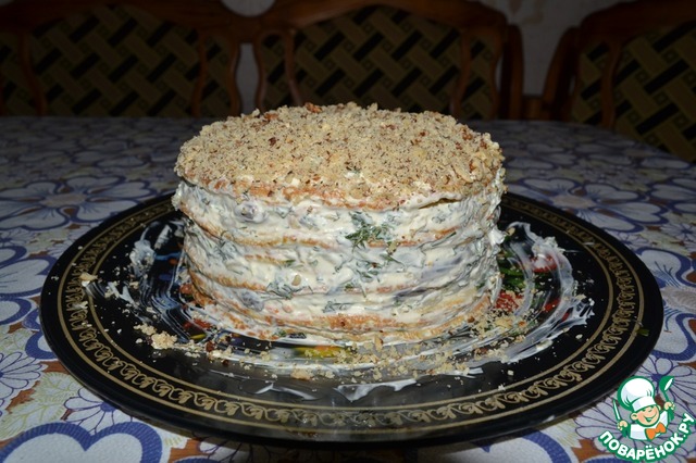 Сочный, шикарный, бесподобный, наивкуснейший…просто не хватит слов, чтобы описать этот закусочный тортик! На столе смотрится очень аппетитно и празднично, съедается на ура, сырные коржи готовятся не сложно – на сковороде…ну что ещё написать? Да, гости от такой закуски в полном восторге!