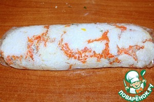 При помощи пленки свернуть рулетом. Ничего страшного, если появились прорехи, они закроются сухарной крошкой.