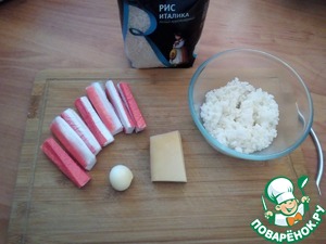 Натираем палочки, сыр и чеснок на тёрке. Отправляем к рису. Добавляем майонез.