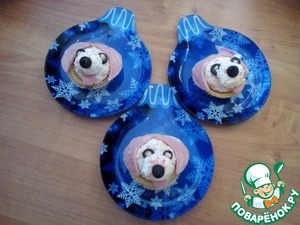 Мокрыми руками формируем шарики, по диаметру подходящие для тарталетки. Выкладываем шарик в неё и чуть приплюсним. Вырезаем из ветчины языки для собачек. Далее формируем шарики меньшего диаметра и выкладываем на языки. Опять приплюсним.