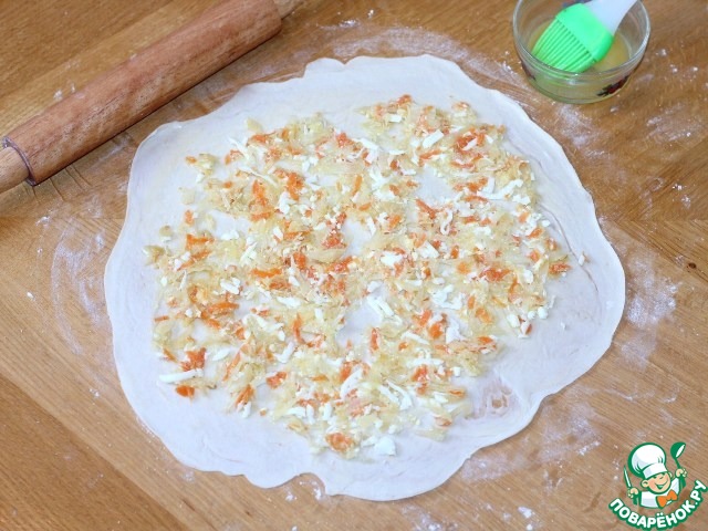 11. Припыляем столешницу мукой. Берем по одному двойному кругу и аккуратно раскатываем очень тонко тесто, Ф = 30 см. Тесто пропитанное маслом раскатывается очень легко, главное не порвать круг. Смазываем круг растопленным сливочным маслом и кладем 1/4 часть начинки.