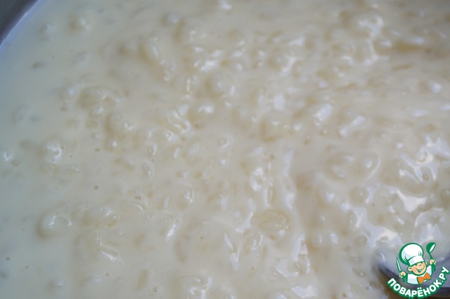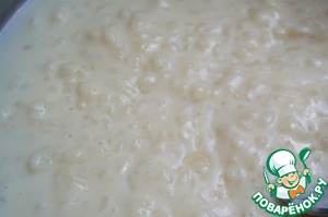 Молоко смешать с 250 мл сливок, добавить сахар и ванилин. Молочно - сливочную смесь довести до кипения и ввести промытый рис. На очень медленном огне под крышкой, периодически помешивая сварить рисовую кашу. Рис нужно практически разварить. Очень хорошо варить кашу в мультиварке. Кашу остудить и пробить блендером, чтобы получилась однородная масса