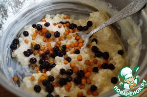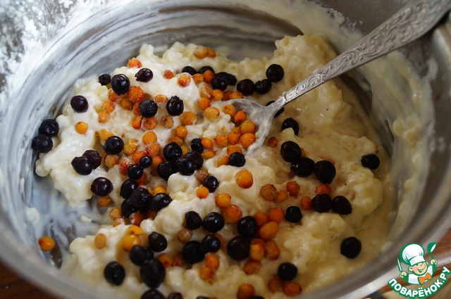 К рисовой массе добавить ягоды. У меня были ягоды черники и облепихи замороженные. В принципе ягоды можно взять любые на ваш вкус, но желательно замороженные, чтобы они не отдали свой цвет вашему мороженному.