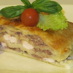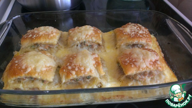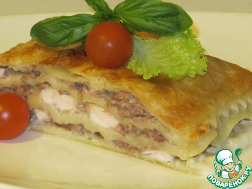 Затем опять тесто, фарш. Верхний слой должен быть из теста.