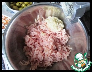 Куриное филе пропускаем через мясорубку с мелкой решеткой. Лук и чеснок также пропускаем через мясорубку.