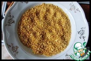 Кукурузные хлопья выкладываем в пакет, завязываем пакет, кладем на разделочную доску и скалкой его, скалкой! Измельчаем хлопья в крошку, перекладываем в широкую тарелку