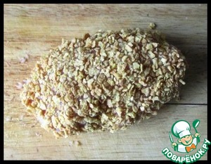 Формируем большую котлету, обваливаем в кукурузной крошке.