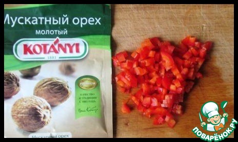 Перец нарезаем мелкими кубиками. Свежий перец вполне заменим маринованным, вместо перца можно использовать маринованный огурчик, вяленые томаты, маслины, т. е. сообразно вкусу и фантазии.
