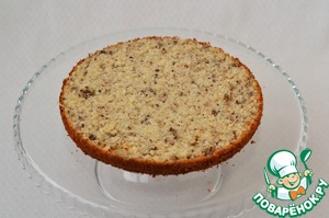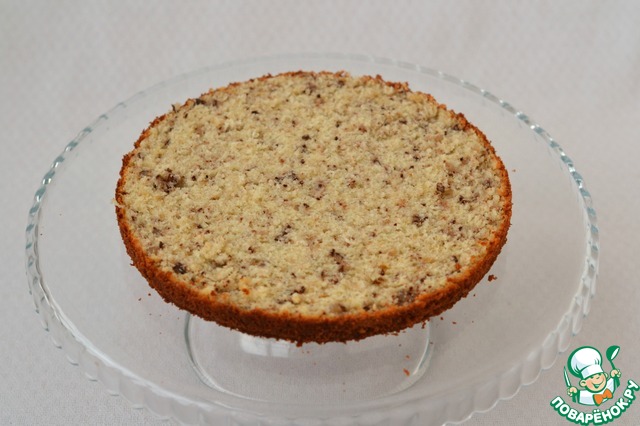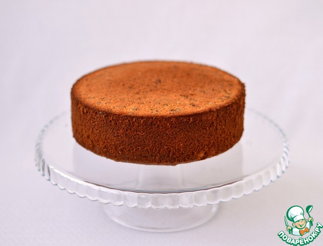 Готовый бисквит остудить в форме, вынуть, переложить на решётку. Дать полностью остыть. Затем разрезать на 3 коржа.