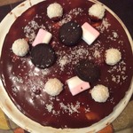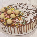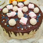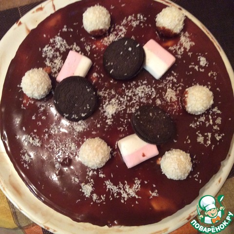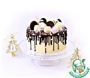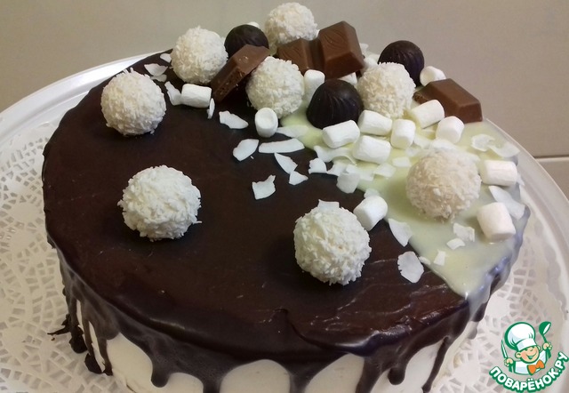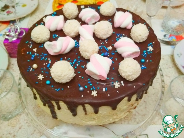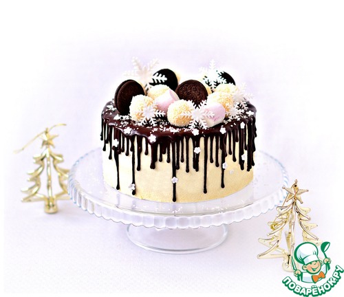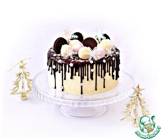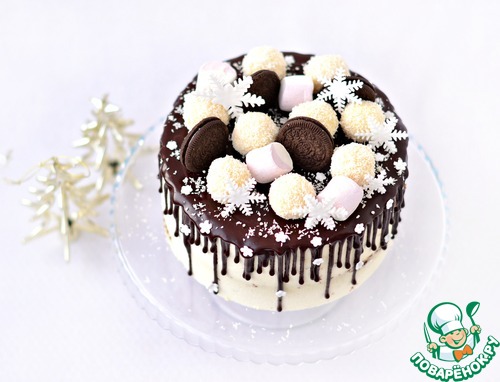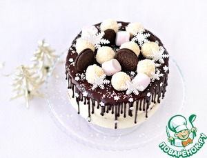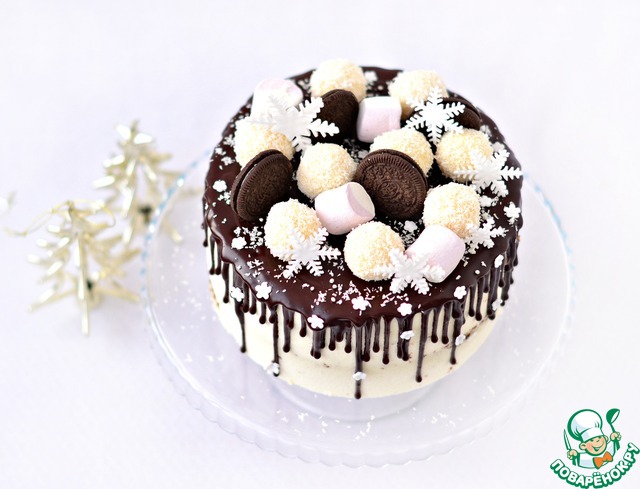 Украсить торт по желанию. У меня кокосовые конфеты, шоколадное печенье, маршмеллоу, снежинки из мастики.