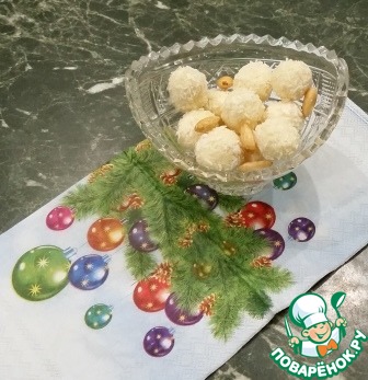 Кокосовые конфеты можно взять из коробки, а можно приготовить самостоятельно. Для этого кокосовую стружку (130 гр) смешаем с ванилином (на кончике ножа) растопленным сливочным маслом (25 гр). Добавить сгущенку (200 гр), хорошо перемешать. Накрыть пленкой. Оставить набухать часов на 6. Отщипывать от массы небольшие кусочки, внутрь класть миндаль и скатывать шарик. Обвалять его в кокосовой стружке. Конфеты готовы!
